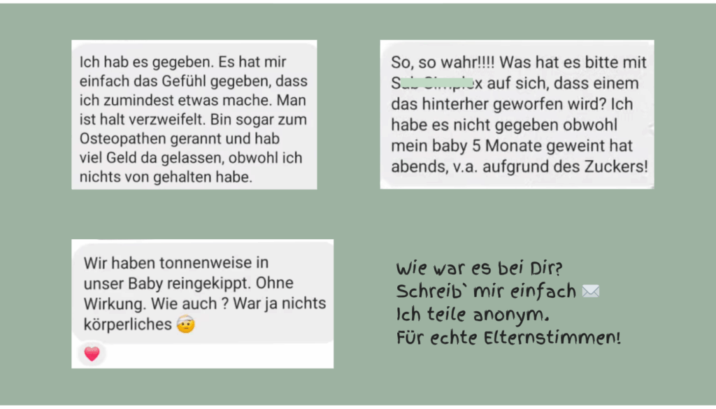 Trotzdem werden besorgte Eltern immer noch zu oft mit Entschäumer-Medikamenten und entblähenden Tropfen abgefertigt, wenn sie wissen möchten, was ihrem schreiendem Baby hilft. Wie schade!